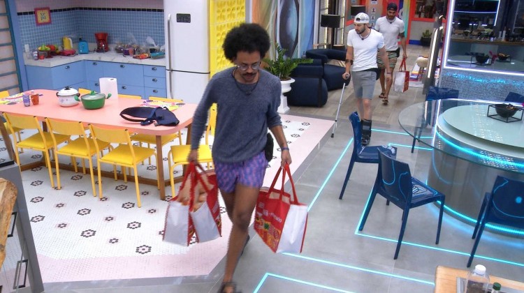 Rodolffo abre a porta da despensa do BBB21 e João Luiz pega a primeira sacola de compras do grupo Vip. Na sequência, Sarah ajuda os brothers a carregarem as compras até a cozinha. A sister começa a guardar os produtos recebidos.