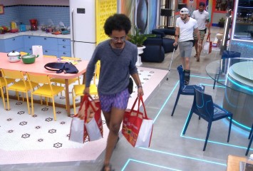 Rodolffo abre a porta da despensa do BBB21 e João Luiz pega a primeira sacola de compras do grupo...